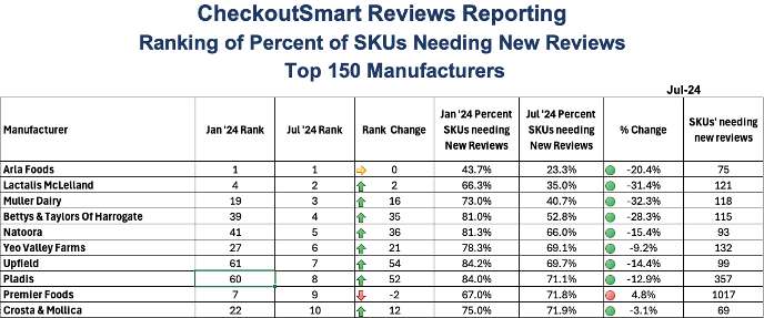 Every Quarter, we analyse the Top 150 UK FMCG manufacturers and their online reputation in supermarkets. Our key reputation KPI is the percentage of SKUs that need new reviews. The fewer the number, the better the manufacturer is managing its reputation.